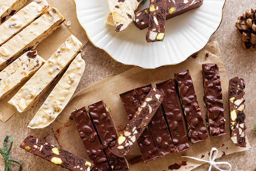Anschließend die jeweiligen Nüsse und Trockenfrüchte unter die geschmolzene Schokolade rühren. Die Masse ca. 1 cm dick auf das Backpapier streichen oder in die Form füllen. Nach Belieben mit dekorativen Nüssen und Früchten bestreuen. Abkühlen lassen und mit einem in heißes Wasser getauchten, scharfen Messer in Streifen schneiden.