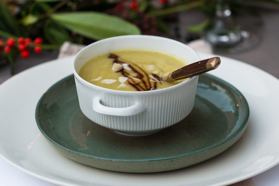 Zum Servieren die Suppenschüsseln mit einem Schuss Aceto Balsamico beträufeln und die Mandelblättchen darübergeben.