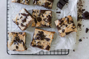Riegel mit Schokolade, Pekannüsse, Cranberries, gepufftem Reis, Hanf, Chiasamen, Kokos-Chips und weißem Mandelmus