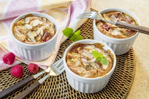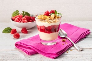 Vanille-Pudding mit Himbeeren und Mandel-Kokos-Knuspermüsli